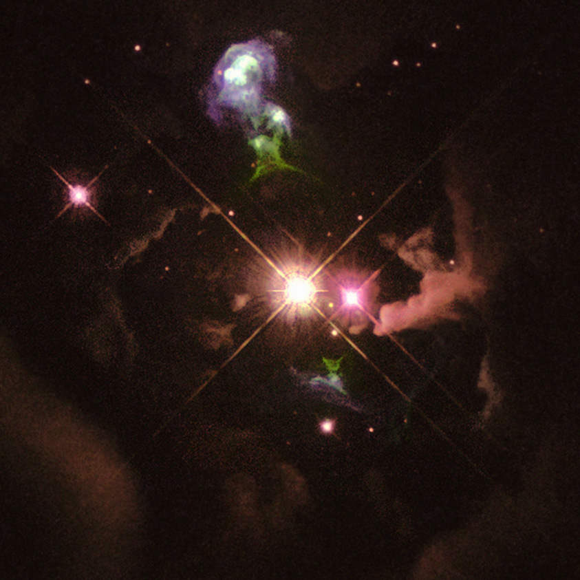 En la escena, las visibles indicaciones de flujos energéticos asociados con estrellas jóvenes incluyen la pequeña y rojiza nebulosidad RNO 109 arriba a la izquierda y el Objeto Herbig-Haro llamado HH32 arriba y a la derecha del centro.